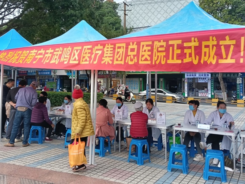 揭牌同日,总医院组织我院、广西医科大学附属武鸣医院、城区妇幼保健院、更昌医院等单位在城区文化中心广场开展大型惠民义诊活动,现场汇聚多领域专家,为居民提供健康咨询,个性化指导,血压、血糖检测等全方位服务,用热情传递服务,用服务传递医改温度,用紧密协作为群众织牢区域健康服务网,将总医院首波健康福利送至群众身边。