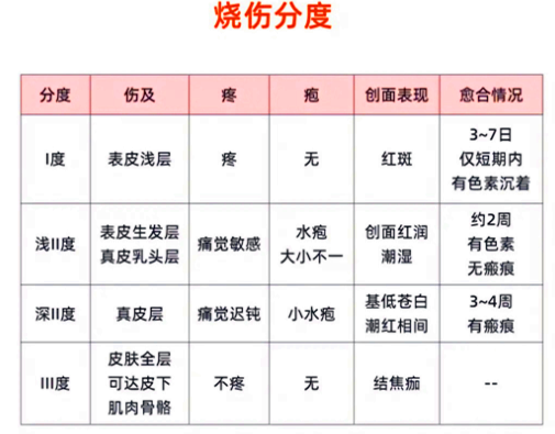 Ⅰ度:损伤最轻,仅伤及表皮浅层,表现为局部发红、灼烧感,3-7天后愈合,不留疤痕;