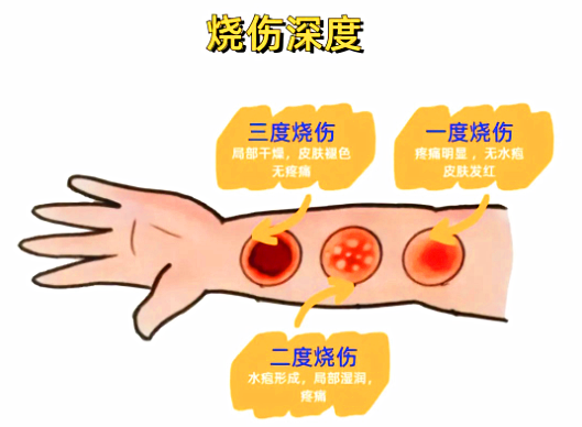 烧伤根据皮肤受损的深浅分为Ⅰ度、浅Ⅱ度,深Ⅱ度、Ⅲ度。