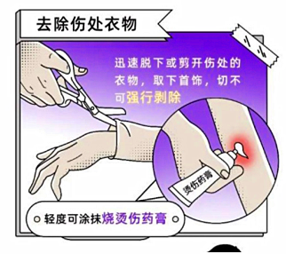 2.脱:冷水降温后,小心脱去衣物,同时摘除手镯、戒指等,如脱不掉可剪开,不可强行剥除。