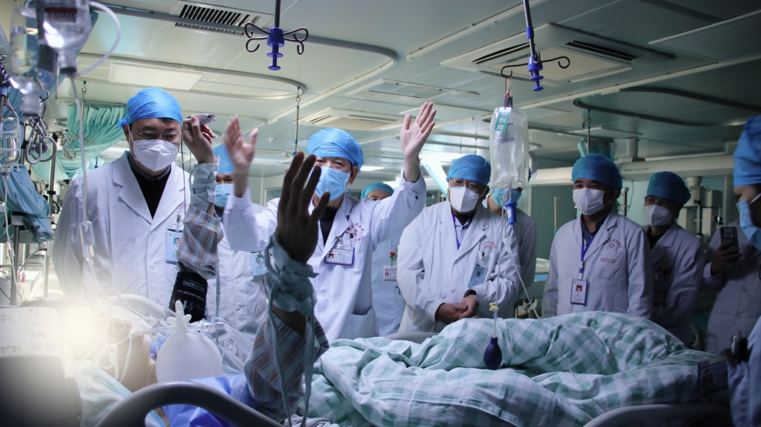 校附属医院副院长带领专家队伍进入ICU病房探视小粟同学,此时患者已能保持清醒,并可在医护人员的指引下做简单的肢体动作。